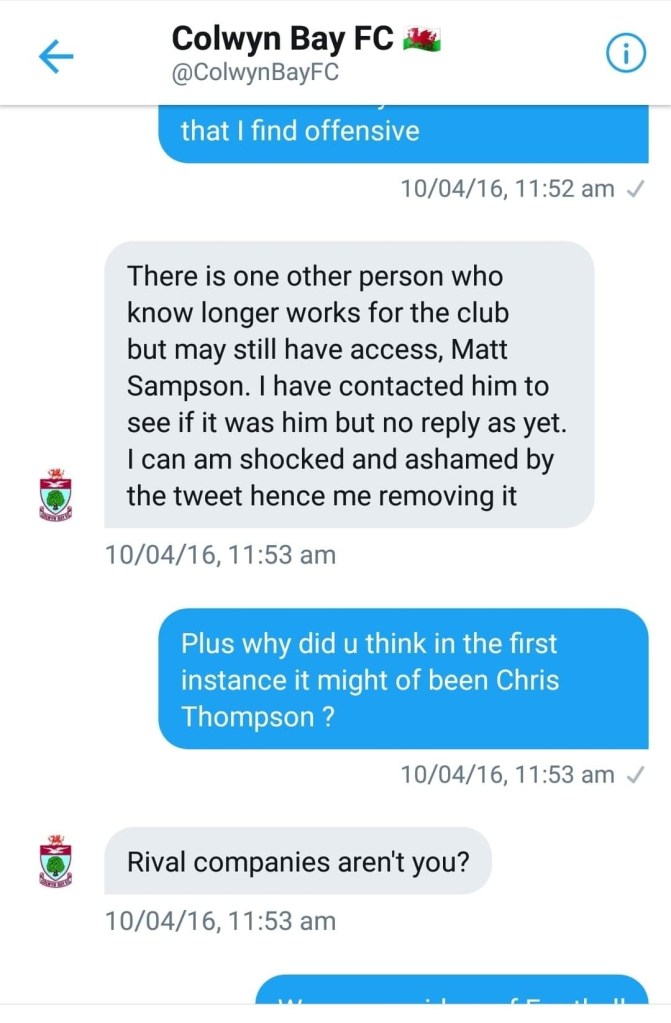I will allow Colwyn Bay Football Club 24 hrs to apologise to me on their Relevant social media pages before I release a full statement of the evidence I have. Not forgetting the trauma from personal of Colwyn Bay Fc, put me through over many Years.