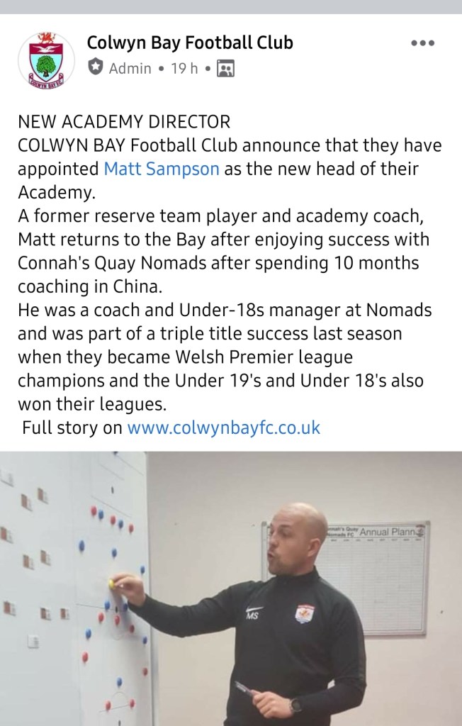 Colwyn Bay Fc, why did you delete your post that Matt Sampson was your new Academy Director ? and then frantically make a big ammendment to that Post ??