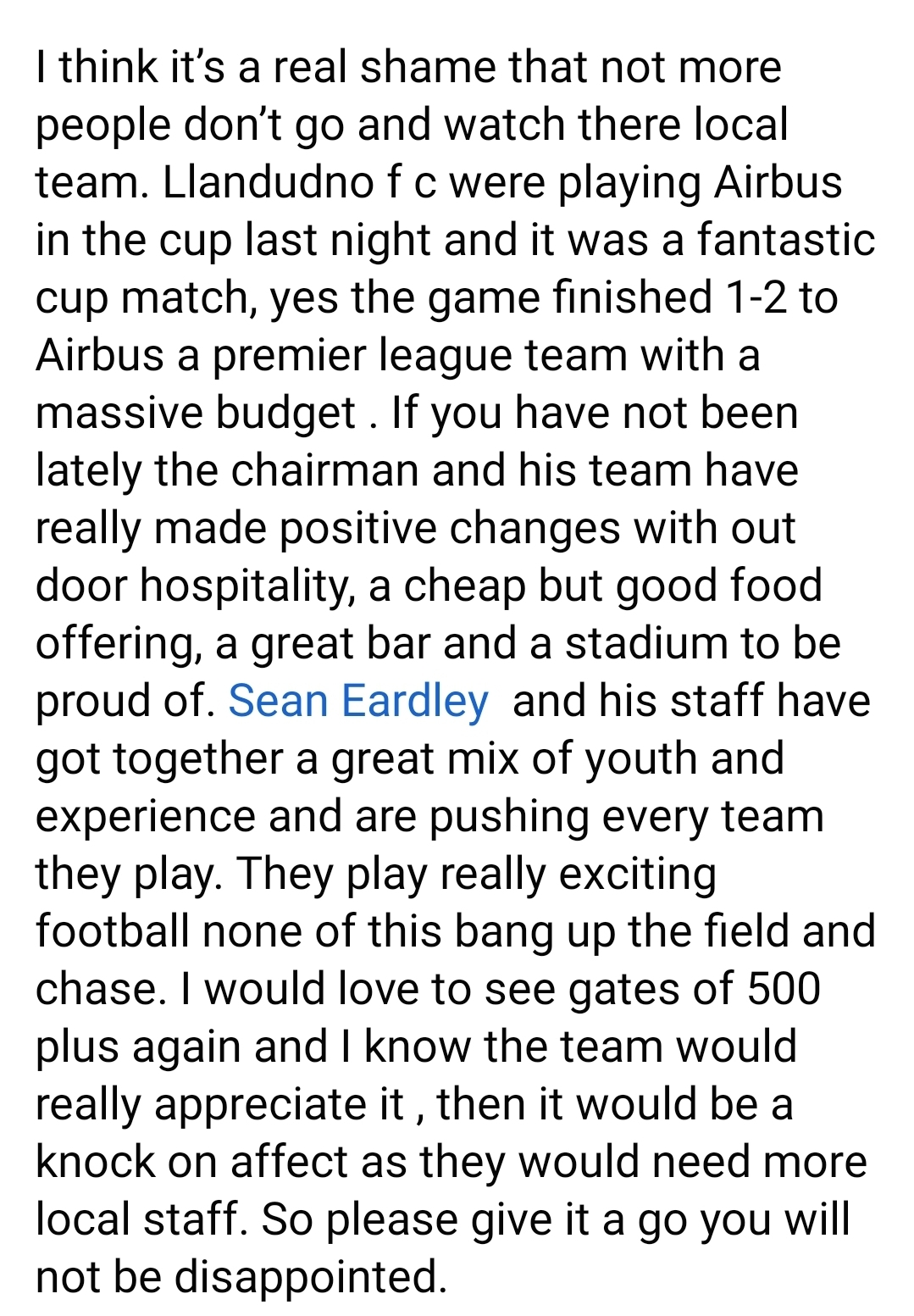 To finish of, it seems Llandudno Fc are struggling for fans, I WONDER WHY THAT IS?, as you treat the locals and a Former Assistant manager and Coach like Sh#t and hope you get away with it.
