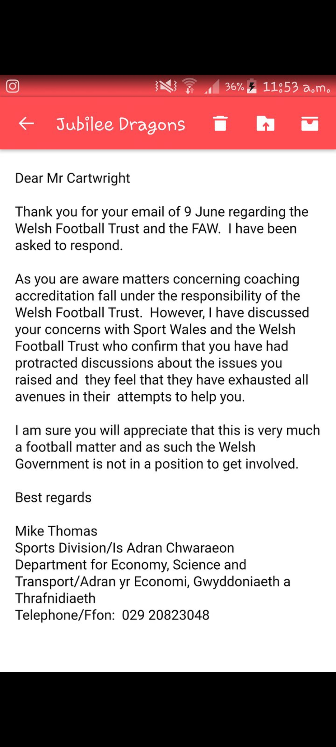 I had enough and contacted the Welsh Government who in their reply had contacted both Faw Trust and Sport Wales