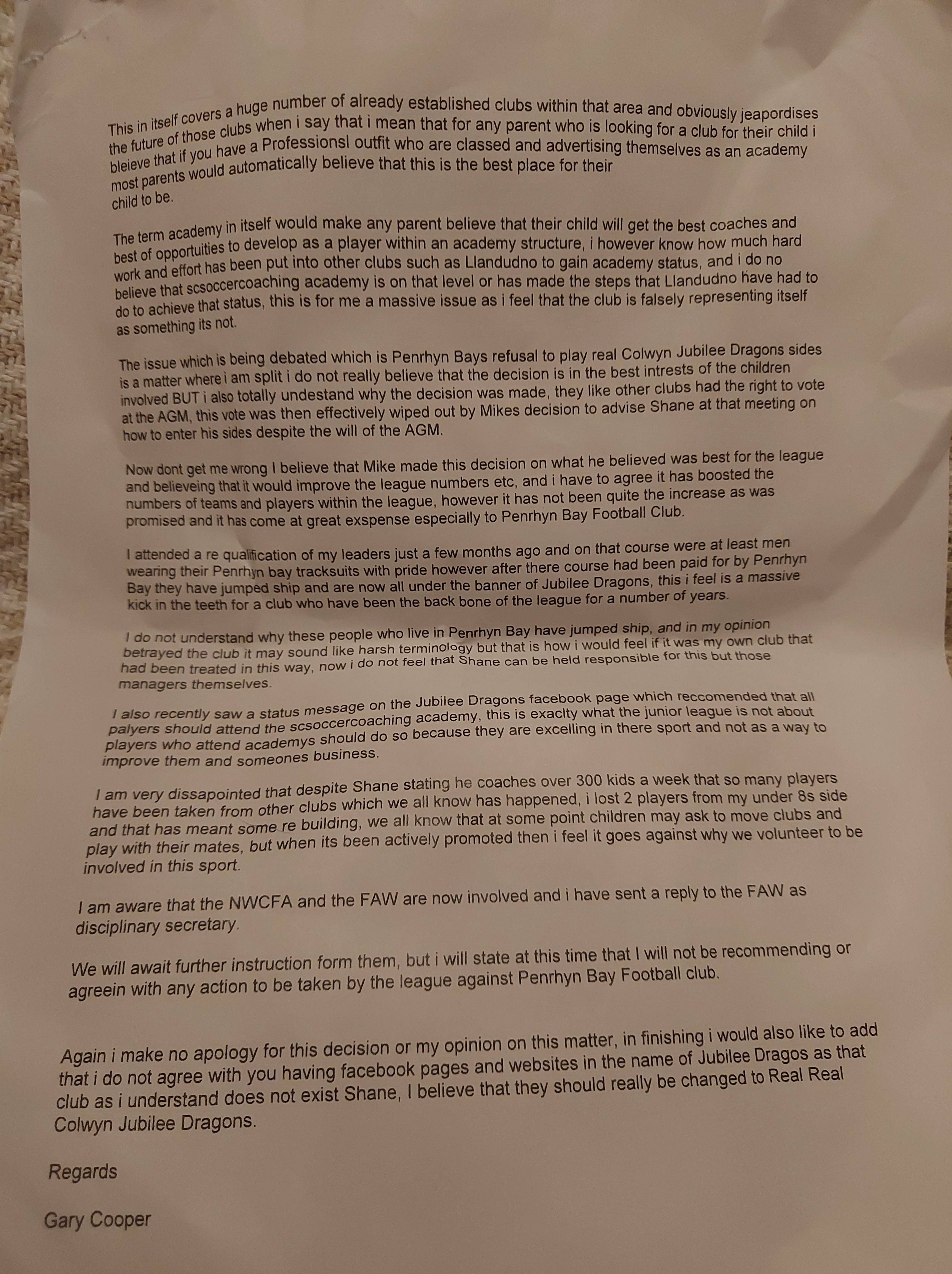 Here in Police officer Gary Coopers own words you will find a letter he sent in regards my Club Jubilee Dragons junior Football club and Myself and buisness. I call it slander!
