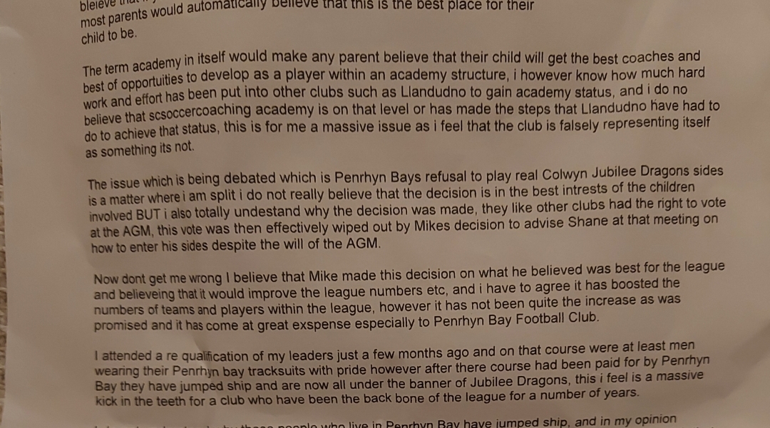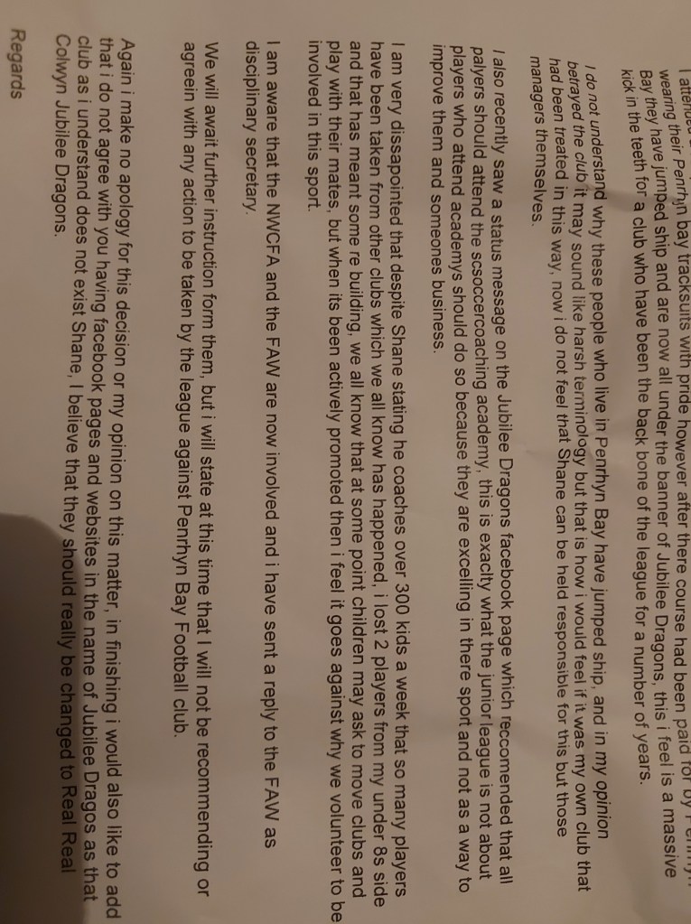 Whilst you used your power as Vice Chairman of the local Colwyn and Aberconwy Junior Football League and wrongly/incorrectly voted, even when you were all aware of the FAW rules you still bullied me, causing unimaginable upset and embarrassment.