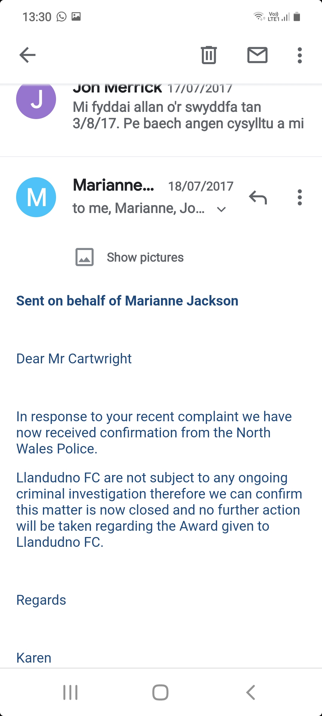 You can clearly see a response by Conwy County Borough Council stating they have spoke to North Wales Police. So the council state clearly their intentions to not pursue or investigate Llandudno Fc.