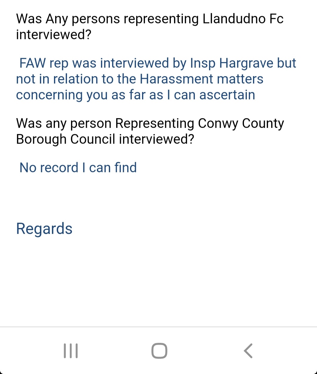 I would presume this is where North Wales Police said no criminal charges were being brought against anyone at the club for any offence???. This is where they hid the fact they didn’t investigate Police officer Mike Smith who was the Director at the club. Also note Sam Williams also of Llandudno Fc, who had sent the racist Tweet.