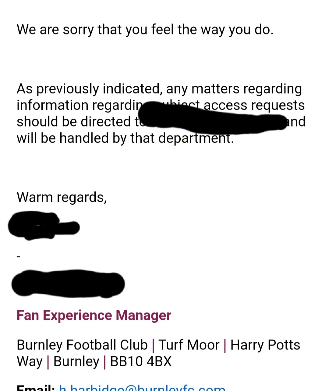 I cannot show you, as yet the responses as I’m waiting for a Subject axcess request to be finally sanctioned and sent to me, including all emails, Transctipted phone calls and any other internal emails Burnley Fc are legally bound to provide.