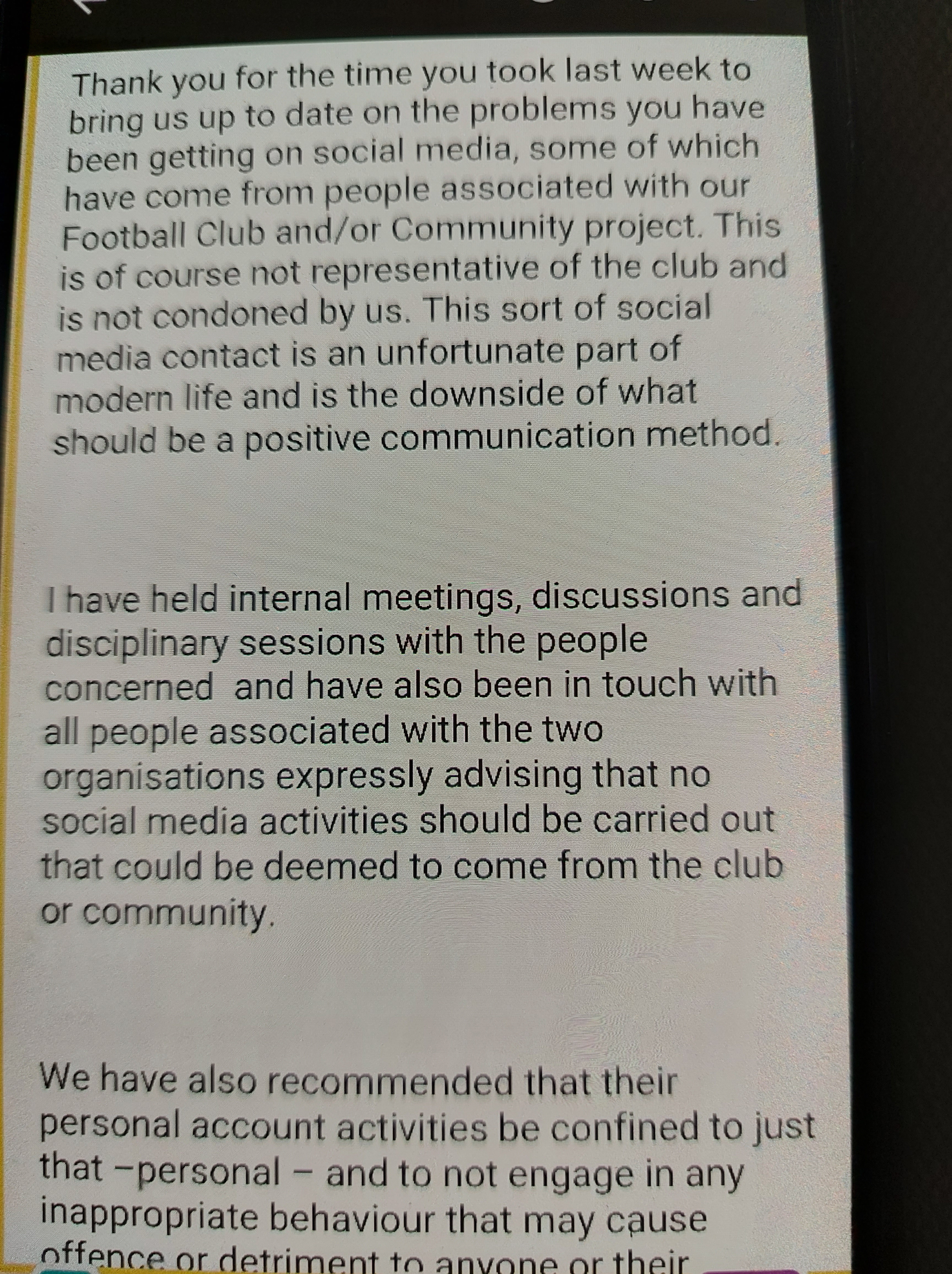 Here is the internal investigation from Llandudno Football club, who’s members using Fake profiles on twitter and Facebook discredited me and my buisness.